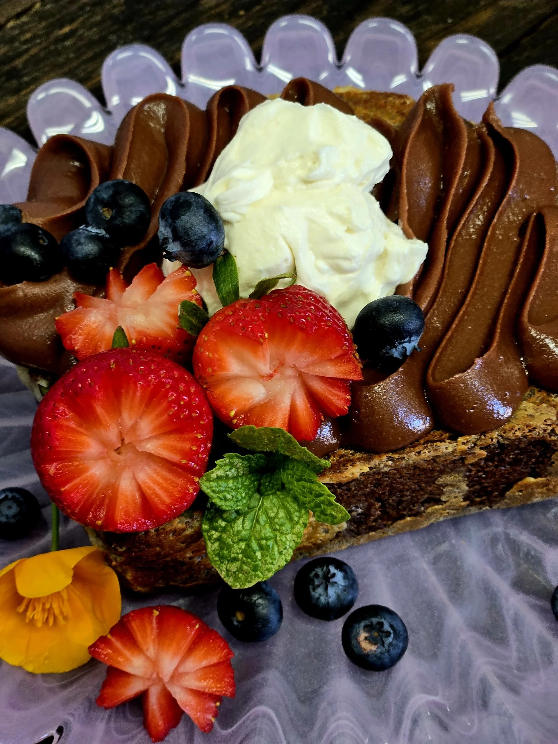 • Chocolate Tres Leches French Toast – Our house-made chocolate brioche soaked in tres leches, topped with chocolate fudge, whipped cream, fresh berries and edible flowers.